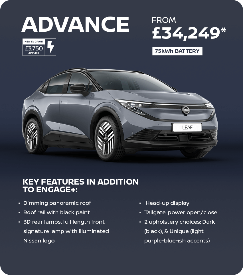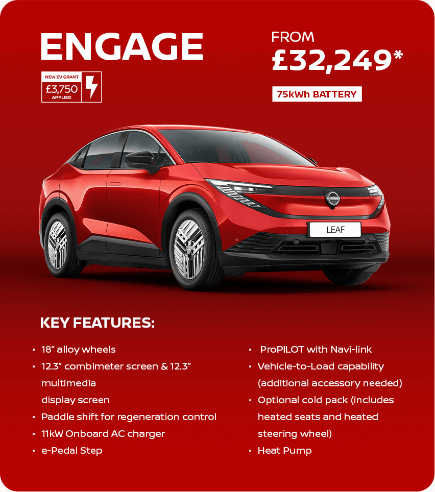 (1) Figure shown is indicative and shown for comparability purposes only. 386 miles range refers to the LEAF 75 kWh Engage on a WLTP Combined Cycle. All derivatives are fully homologated against the standards of the Worldwide Light Vehicle Test Procedure (WLTP). Actual real-world driving results may vary depending on factors including the starting charge of the battery, accessories fitted after registration, weather conditions, driving styles and vehicle load. Range quoted is based on 100% starting state of charge.
