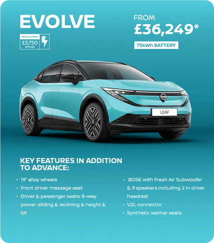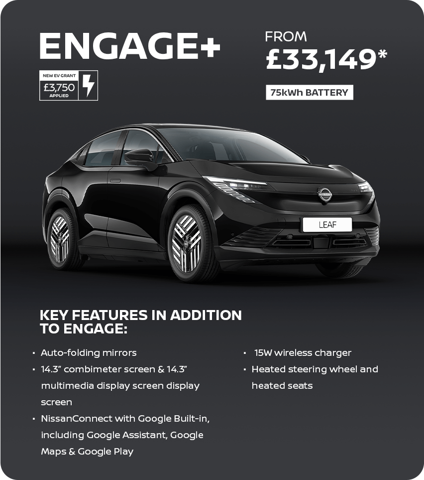 The all-new Nissan LEAF is the electric family car that brings together smart technology and easy usability. Starting from £32,249, the new Nissan LEAF is one of the few cars to be awarded the full EV Grant of £3,750. With its leading electric technology, you can expect a driving range of up to 386 miles on a single charge, ensuring you’re ready for every journey. In just 30 minutes, you can charge from 20% to 80%, allowing you more time on the road to enjoy the surprisingly spacious cabin and over 70 apps available on the infotainment system in the all-new Nissan LEAF.